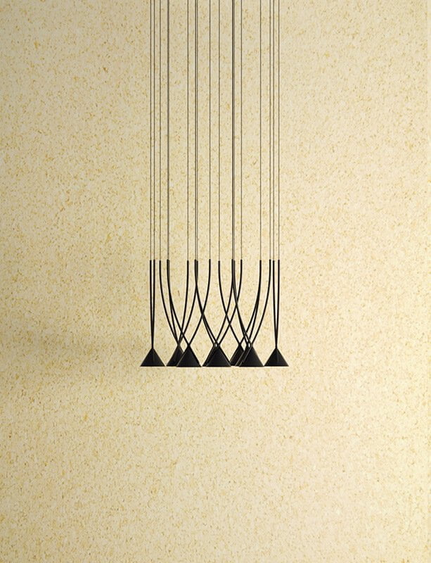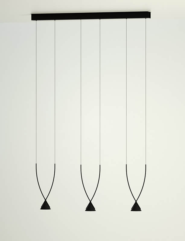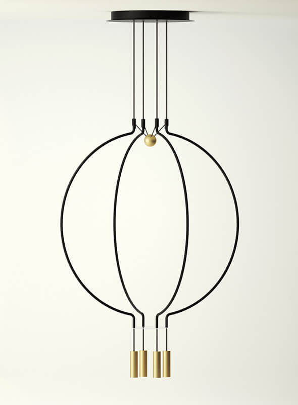 Unica e preziosa, Liaison è una sospensione in metallo che gioca con tre archetipi geometrici – sfera, cerchio e cilindro – che si combinano in una struttura leggera ed elegante. Disegnata da Sara Moroni, Liaison si compone di elementi in metallo color oro opaco e nero, realizzati artigianalmente, che possono dar vita ad un singolo pendente o a composizioni articolate. Seppur decorativi, tutti gli elementi sono essenziali e portanti: il semicerchio abbraccia gli altri due elementi dando forma all’oggetto e conducendo i cavi, il cilindro custodisce la sorgente luminosa a LED, la biglia contribuisce alla creazione di un equilibrio statico.