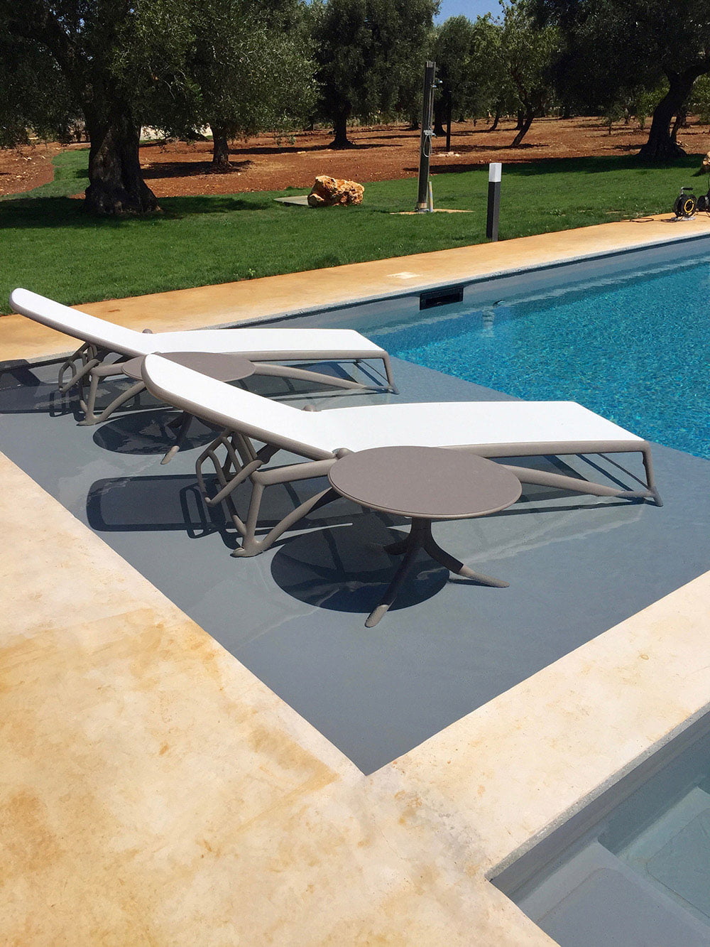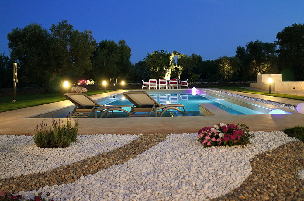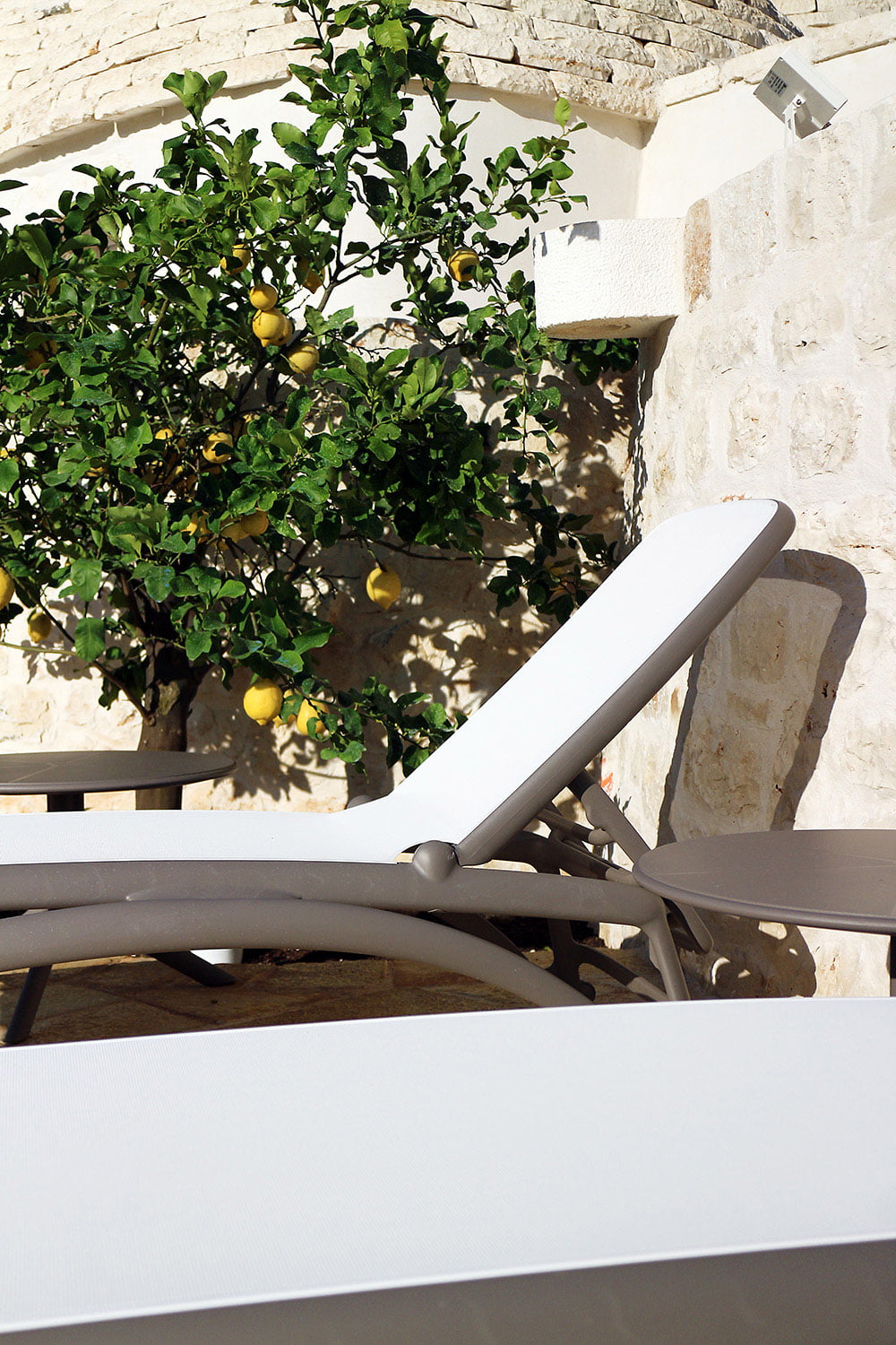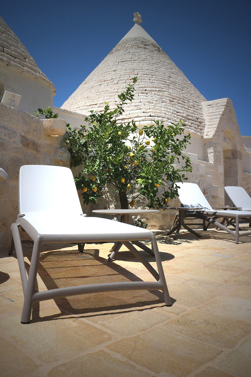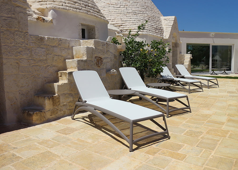 All’esterno un sistema di illuminazione, molto scenografico, permette di godere al meglio degli spazi aperti che contemplano diverse soluzioni di vita conviviale, di relax o angoli più riservati. L’arredo outdoor dei trulli vede protagoniste diverse soluzioni d’arredo Nardi. Il lettino prendisole Atlantico in resina fiberglass e tessuto traspirante con la sua forma slanciata e aerea fa da cornice all’ampia piscina; lo spazioso tavolo per pranzi e cene all’aria aperta Alloro si sposa con le rilassanti poltroncine con cuscini Aria. Gli angoli più appartati sono contraddistinti dal set con tavolino a piano rotondo Spritz e le stilose sedie della collezione Net.
