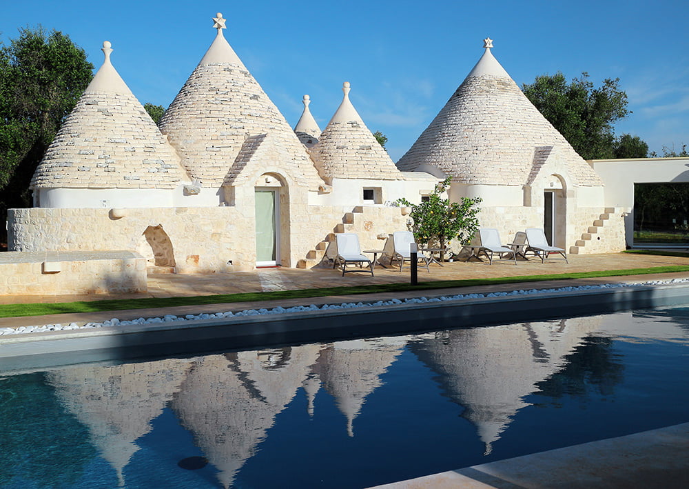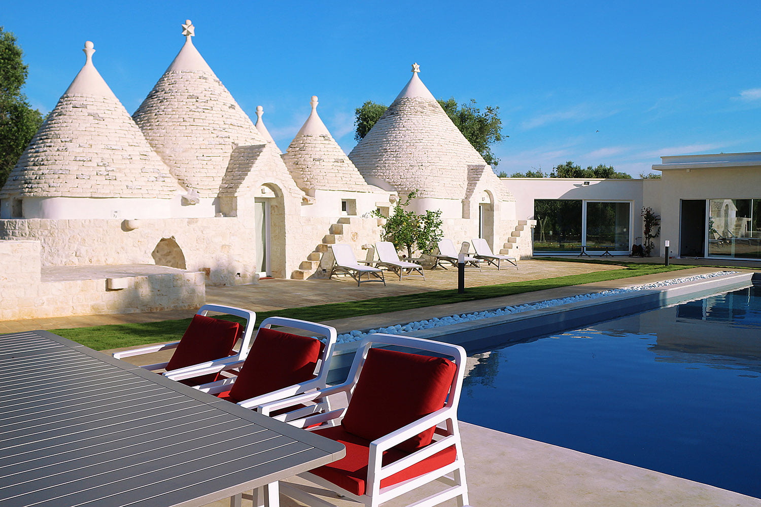 La tradizione incontra il gusto contemporaneo nel relais Villa Aieni di San Vito dei Normanni, in Puglia, un progetto, completato all’inizio di giugno 2016, dove un villaggio di trulli d’epoca è stato completamente ristrutturato per dar vita a una struttura turistica di lusso, dotata di ogni comfort. Circondato da un terreno di 17.000 mq diviso tra giardino e coltivazioni di frutta e ulivi, gli interni del relais presentano una combinazione molto elegante di arredi locali, etnici e contemporanei.