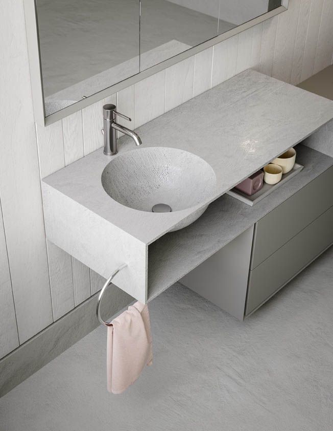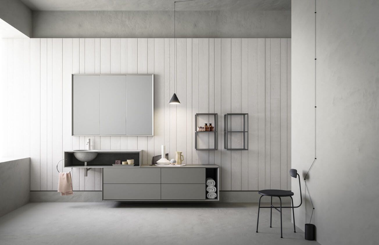 Ampliata e perfezionata, per rispondere alle più attuali esigenze funzionali ed estetiche, Libera+, prevede ora dei nuovi contenitori a giorno, disponibili con una struttura di 10 mm di spessore o realizzati con tubo metallico di 15 mm, laccato nei colori di gamma, per creare piacevoli contrasti di pieni e di vuoti. Si aggiungono, poi, due nuovi lavabi progettati appositamente per questa collezione e adattabili alle diverse dimensioni delle composizioni: il primo è realizzato in finitura cemento ed è costituito da una semisfera saldata su un contenitore cavo che consente di vedere frontalmente il volume curvo del catino, creando un effetto molto scenografico, mentre il secondo prevede un bacino in Teknorit con bordo rialzato lateralmente e un vano di testa che funge da portaoggetti, una soluzione ideale per gli spazi più ristretti.