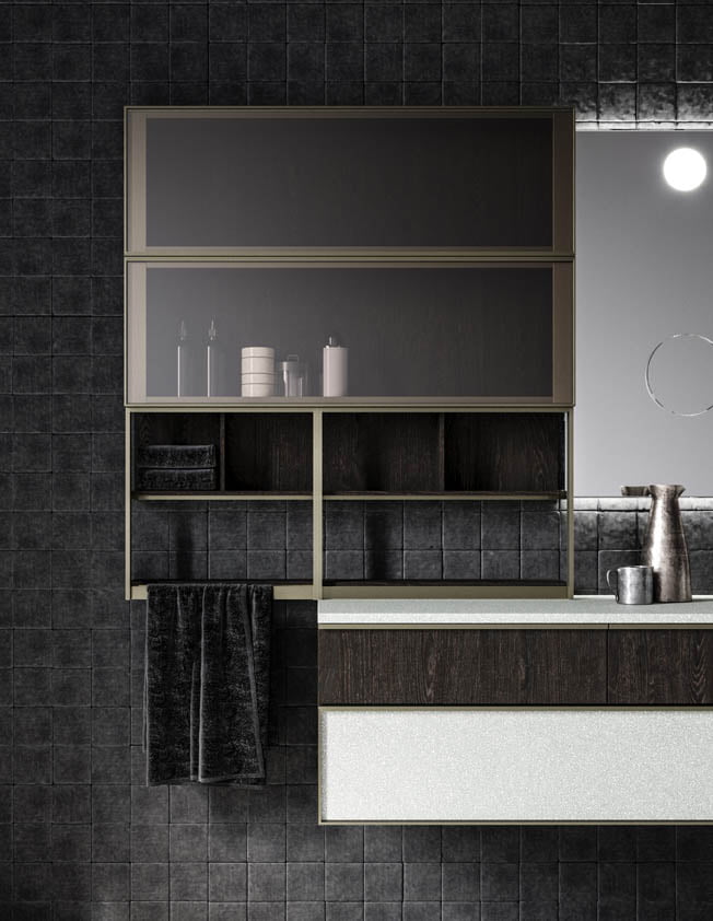 Con Quari, design Stefano Cavazzana, Novello omaggia la propria terra, esaltandone le materie prime e i know-how. Nel design di Quari riecheggiano le tradizioni artigianali veneziane, in primis quella dei maestri vetrai che lavoravano i telai e i vetri di forma quadrata, i “quari” appunto, per realizzarne degli specchi. Due le tipologie di anta: liscia con profilo in alluminio e a telaio, ottenuta abbinando un profilo di alluminio color silenio di 28 mm di spessore a un pannello di 4 mm in diverse finiture, dal vetro al Laminam, dall’essenza al laccato. Le boiserie in alluminio sono pensate per armonizzare le composizioni, collegando mobili, top e specchi, oppure possono essere utilizzate come elementi singoli, con funzione decorativa.