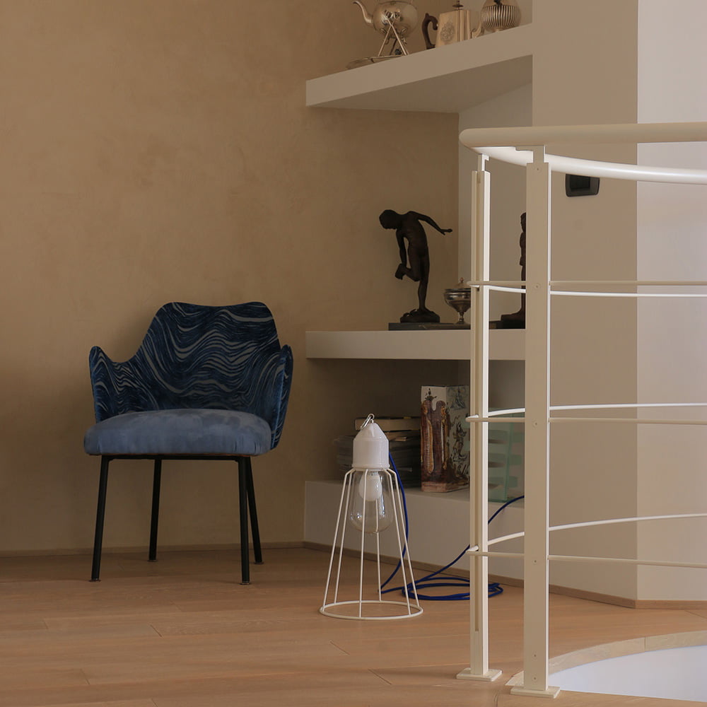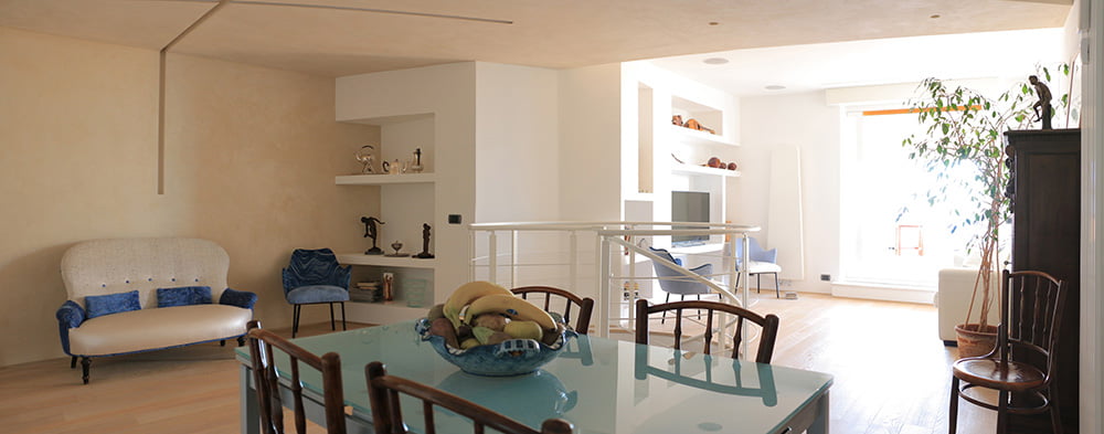 La scala a giorno elicoidale Rizzi (diametro cm 170 www.rizziscale.it) con gradino con struttura in acciaio rivestito in legno, spessore 4+4 mm, in rovere verniciato a campione come il parquet di tutta la casa, crea armoniosamente l’unione fisica tra i due livelli dell’abitazione e concettualmente lega gli spazi dell’abitare, la zona giorno e la zona notte, con un movimento dinamico, elegante e sinuoso che si integra perfettamente con l’ambiente. La leggerezza dell’elemento e i materiali utilizzati (struttura in acciaio e pedate in legno nella stessa essenza del parquet) contribuiscono a percepirlo come parte integrante della realizzazione.