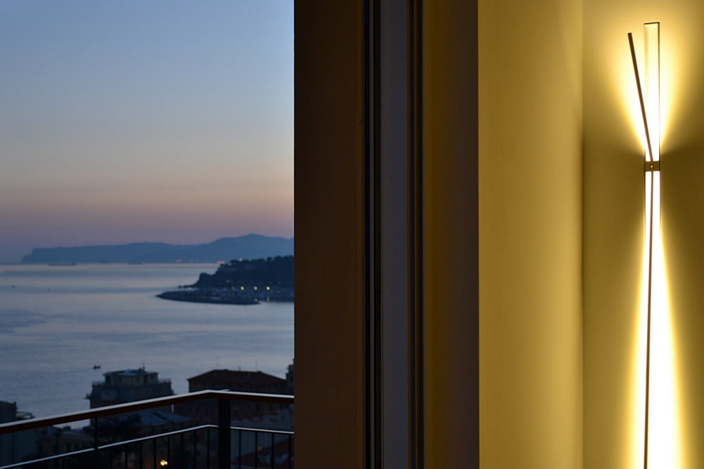 I materiali utilizzati in questo intervento sono legni pregiati, elegantemente sbiancati come fossero stati consumati dal sole e dal salino; la finitura muraria in calce naturale color sabbia; le stoffe damascate dalle tinte azzurre e cangianti tipiche delle acque profonde della Riviera Ligure. Diverse ambientazioni concorrono a completare il progetto illuminotecnico, con luci d’atmosfera ed elementi d’accento: tagli come terre spaccate dal sole, da cui fuoriesce una calda luce d’ambiente; contemporanei elementi lineari che lavorano sulla riflessione delle superfici; spot diretti e mirati con precisione solamente dove occorre.